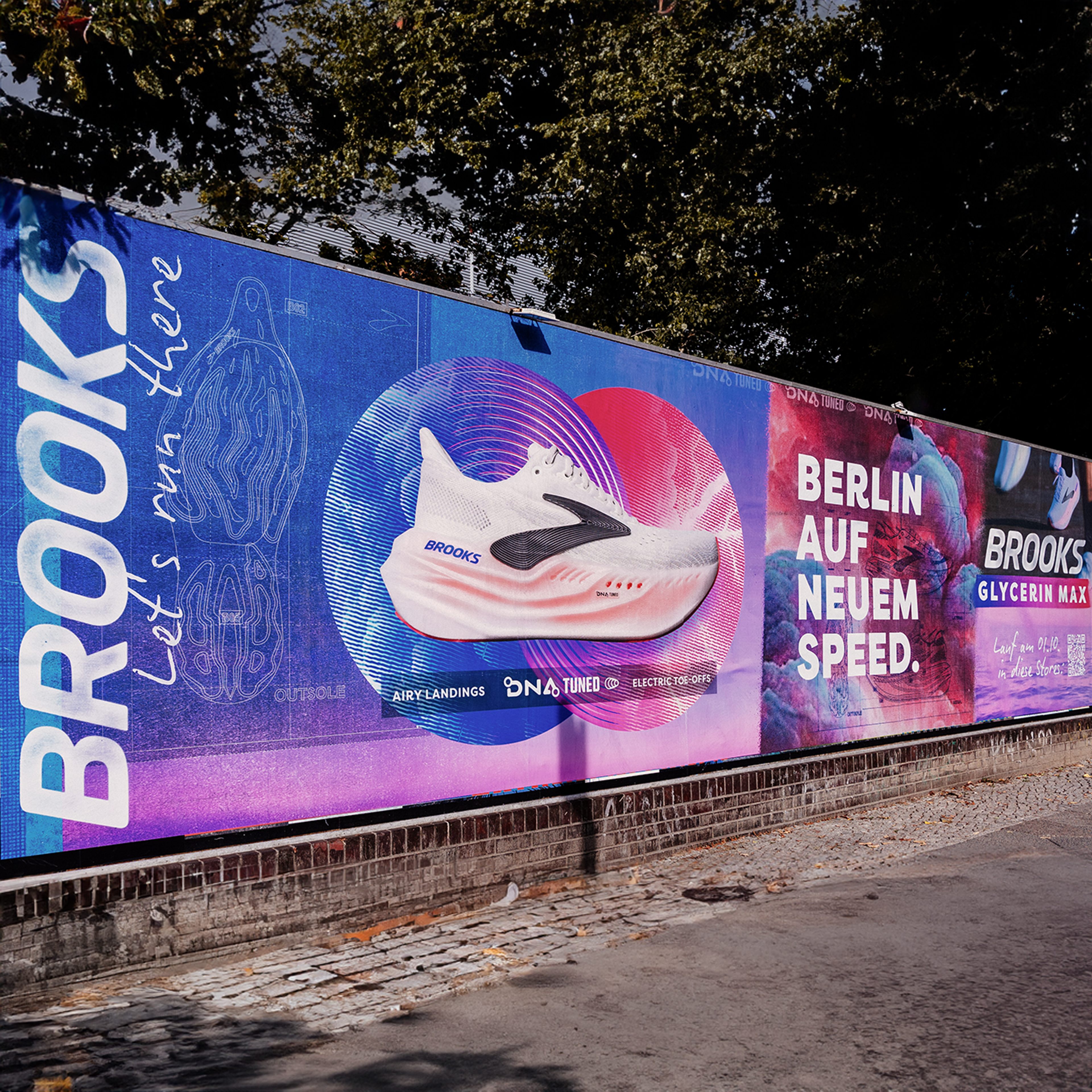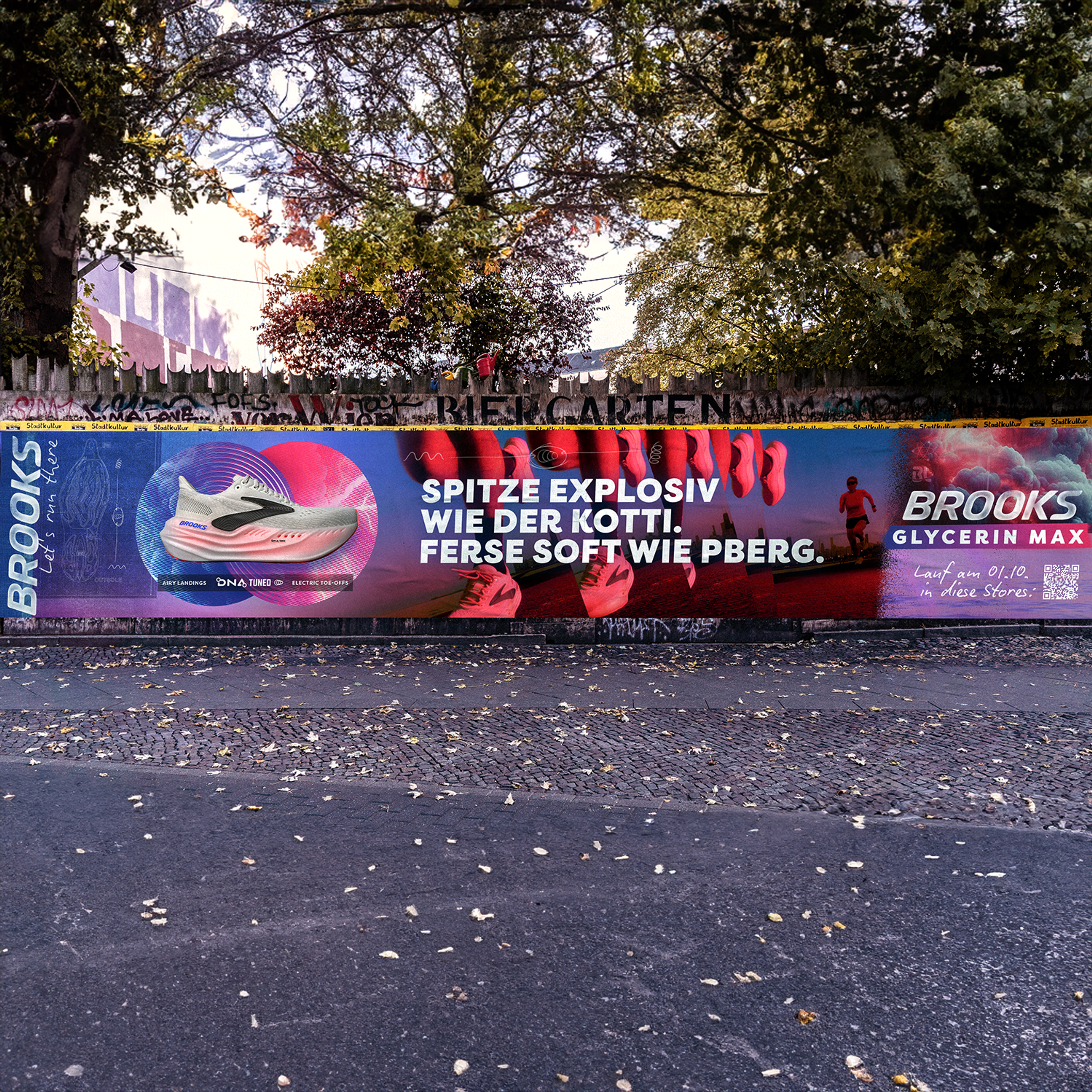 The Berlin Marathon is one of the five most important running events worldwide. For its 50th anniversary, we developed a campaign for the U.S. running shoe brand Brooks to celebrate the launch of the new Glycerin Max. At the heart of the campaign stood one observation: the Glycerin Max, with its innovative new sole, is just like Berlin itself – explosive, light-footed, and always in motion.