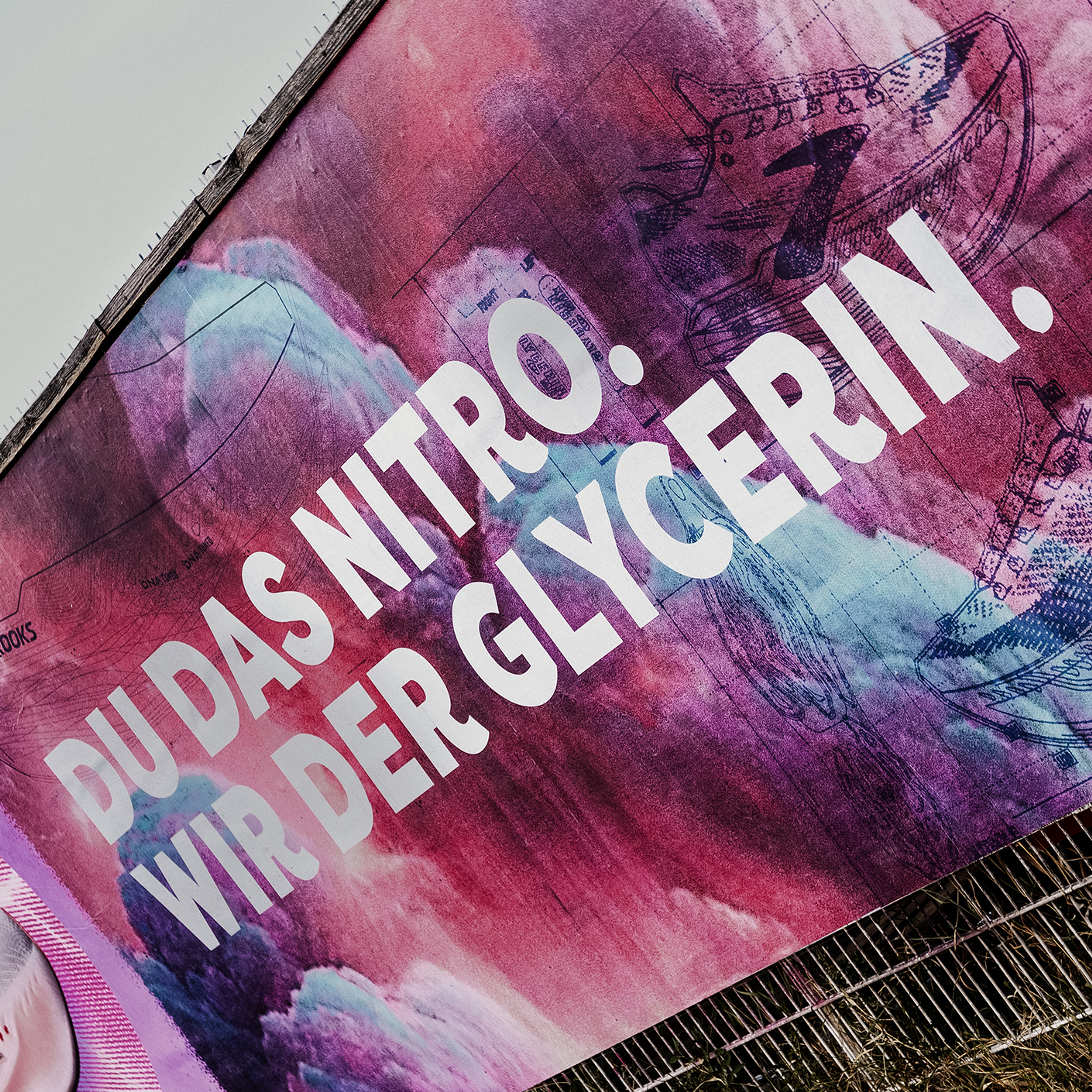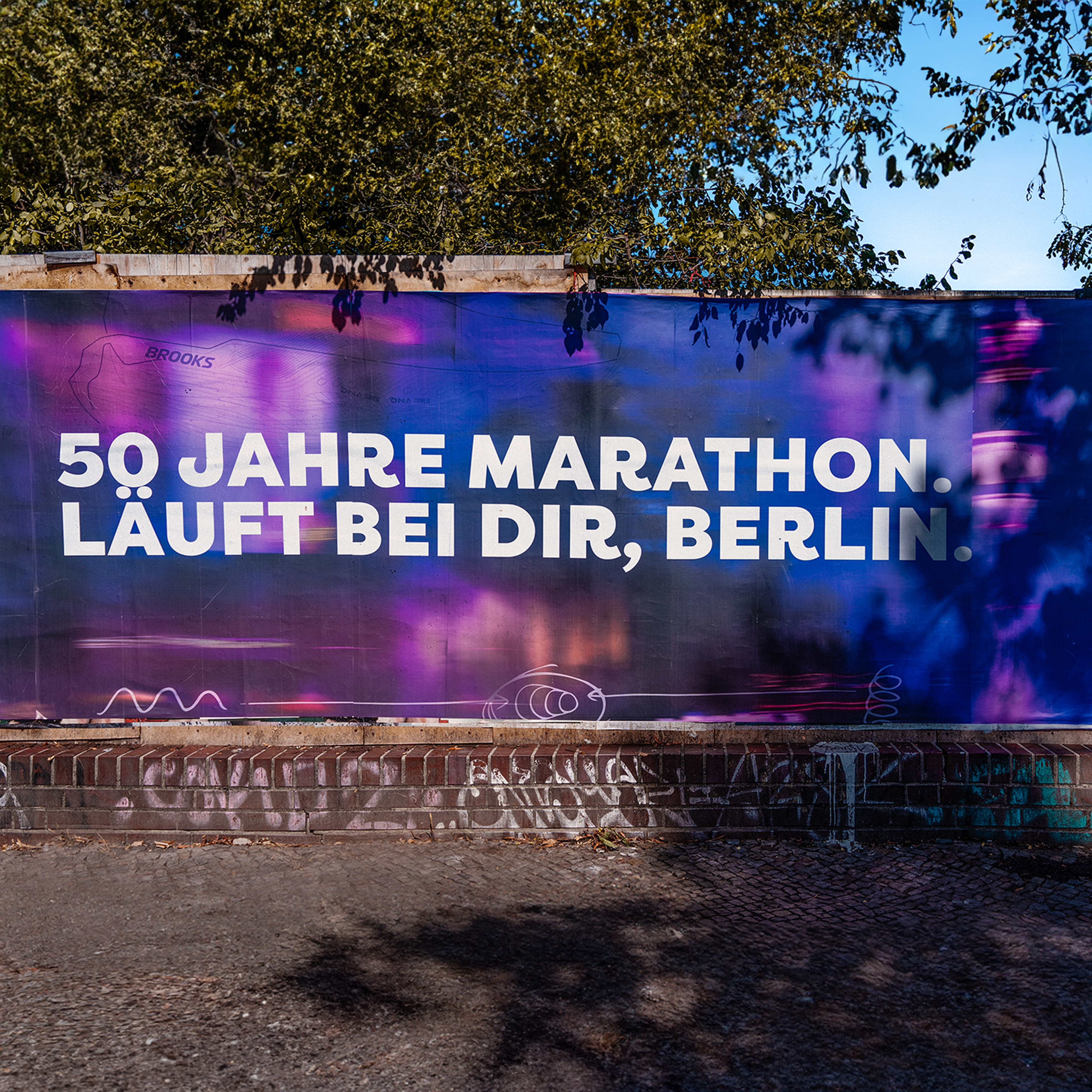 The campaign was placed at various locations throughout Berlin, and for each, we developed a unique message. For example, "Berlin auf neuem Speed" ("Berlin on new speed") was placed near some of Berlin's iconic techno clubs, while "50 Jahre Marathon. Läuft bei dir, Berlin" ("50 years of Marathon. Way to go, Berlin") appeared in front of major running sports retailers.